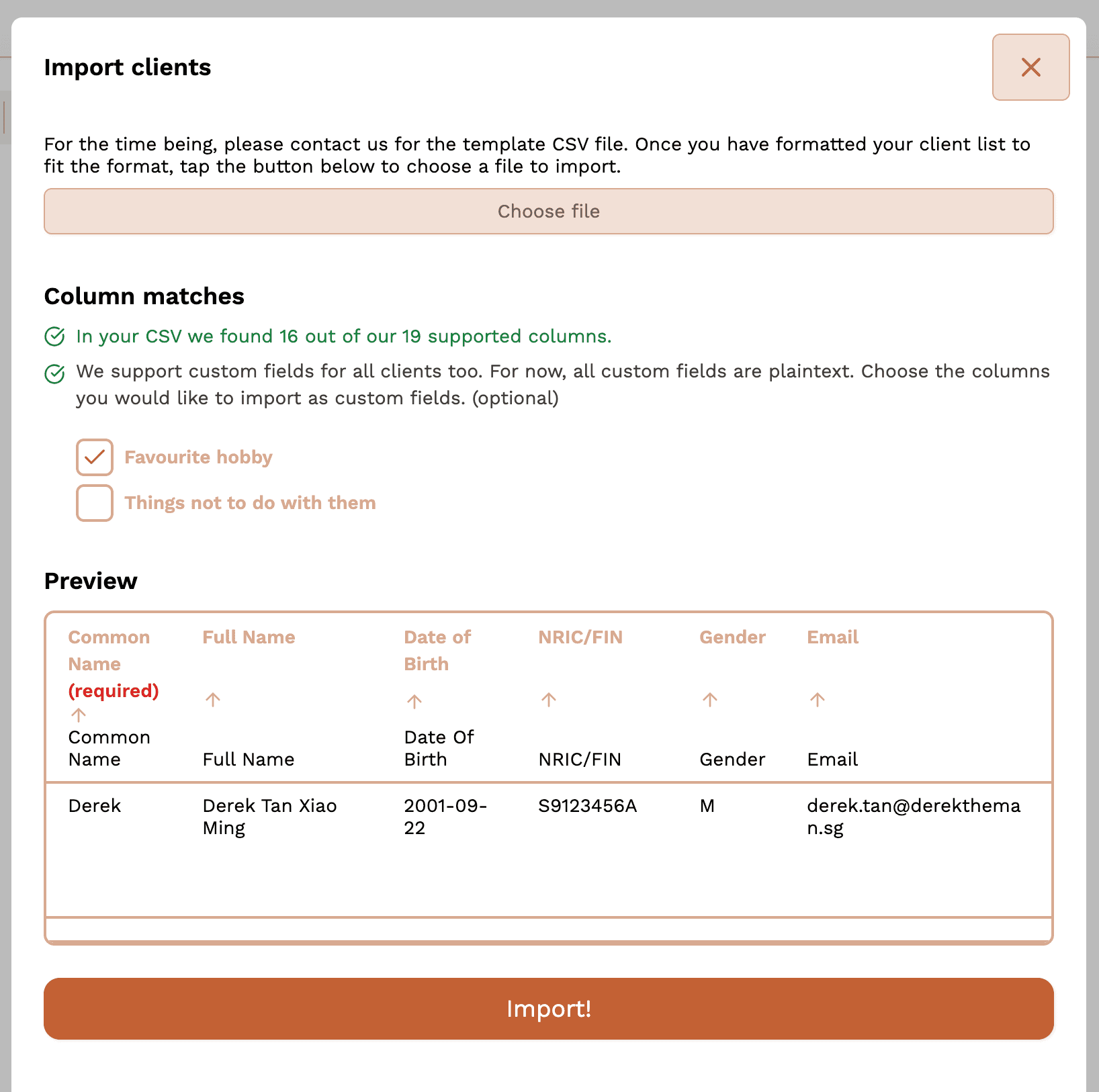 You can use your spreadsheet of clients and change/modify the column headers to match the ones above, or use the template provided above to fill in your client data.